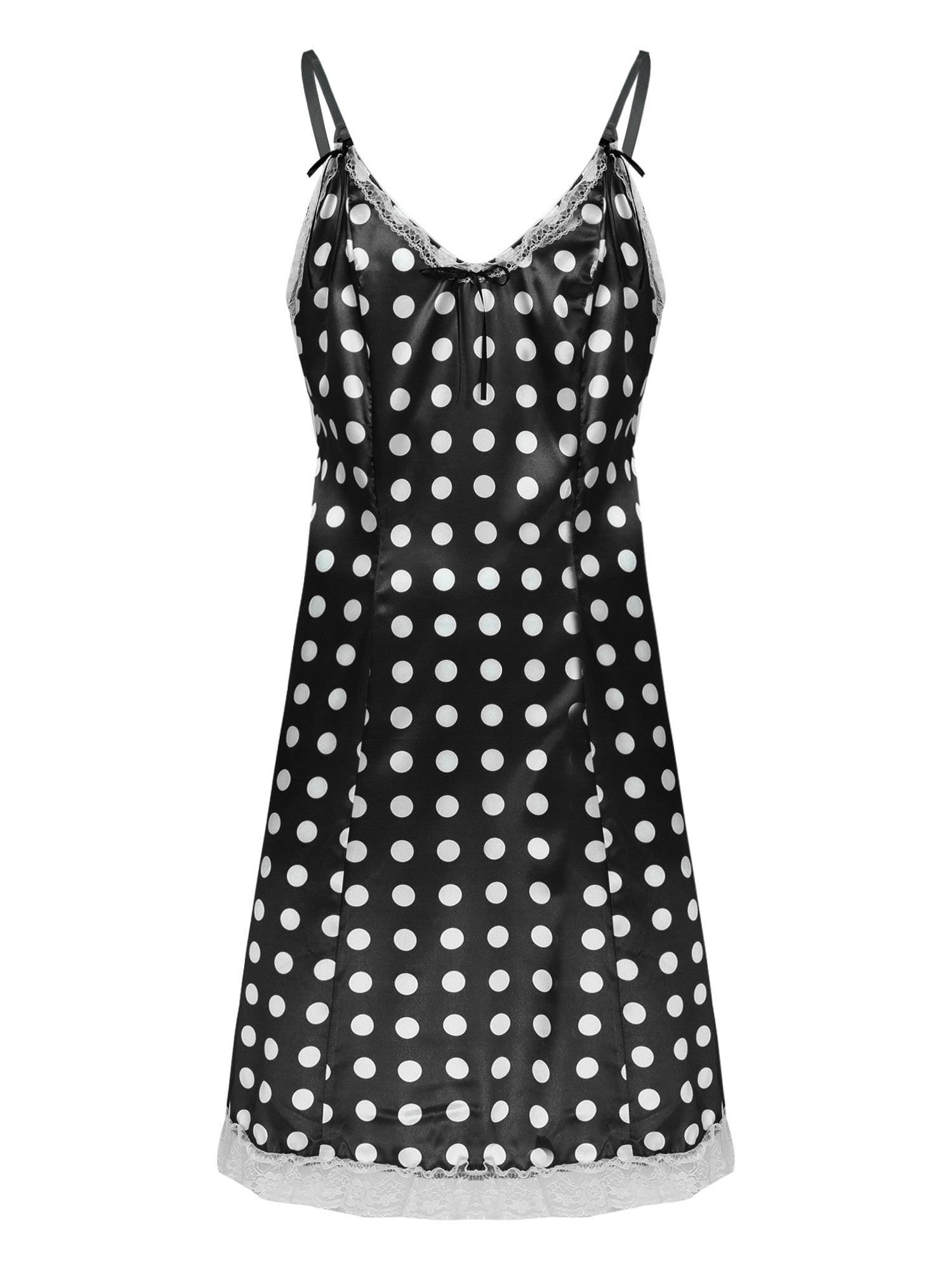 Adjustable spaghetti shoulder straps, v neckline and low back, with ruffled lace hemline.