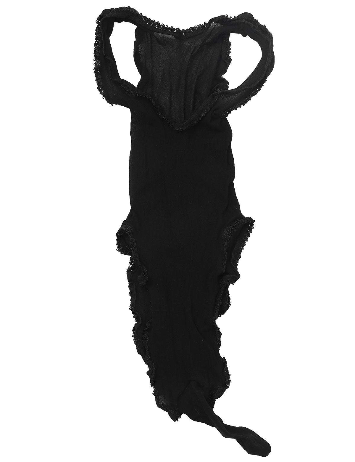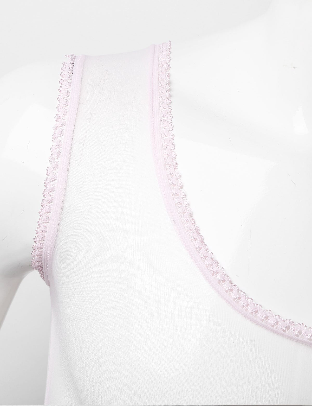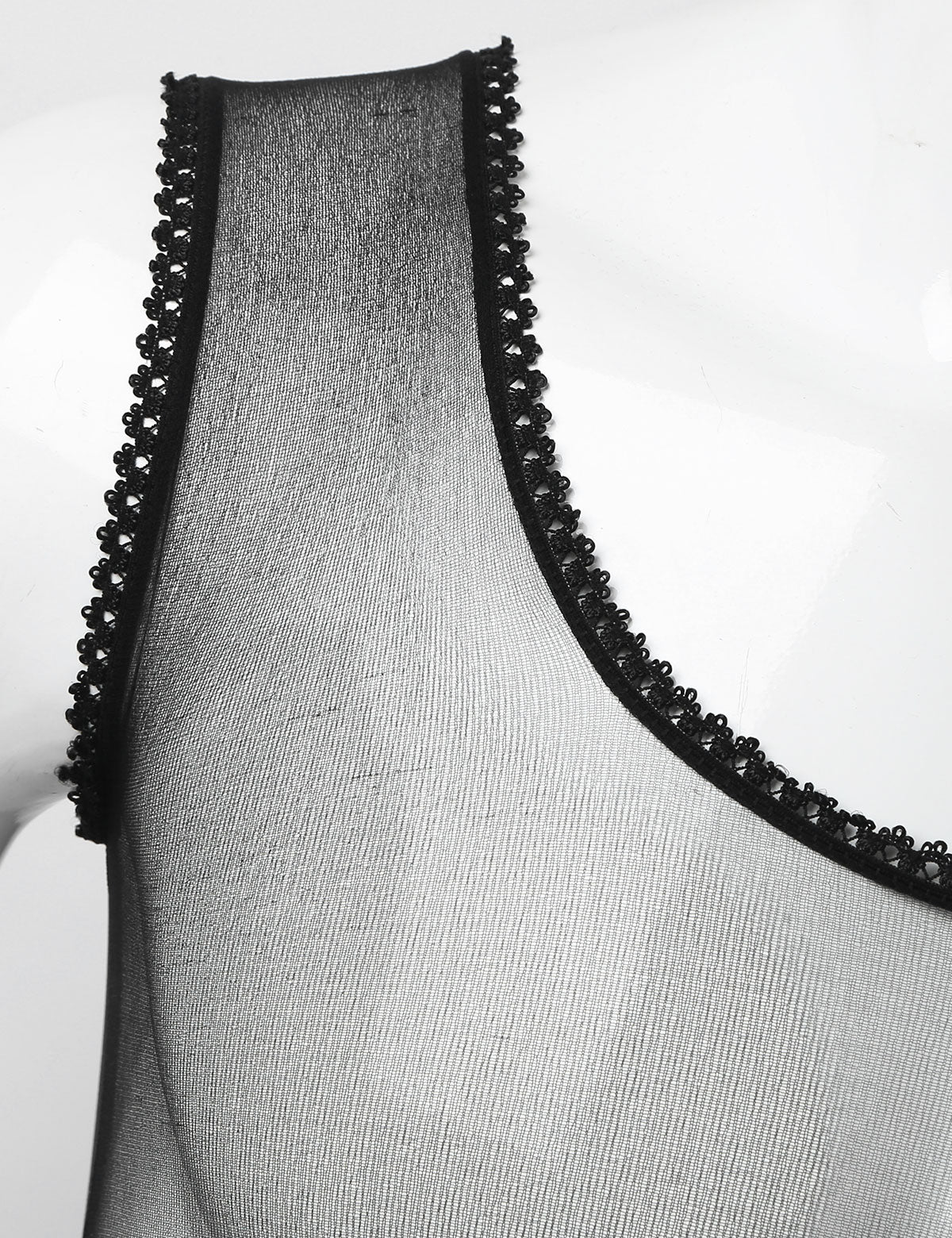 Deep U neckline, sleeveless, sheer Lace around neck and legs, front with bulge pouch, high cut legs.