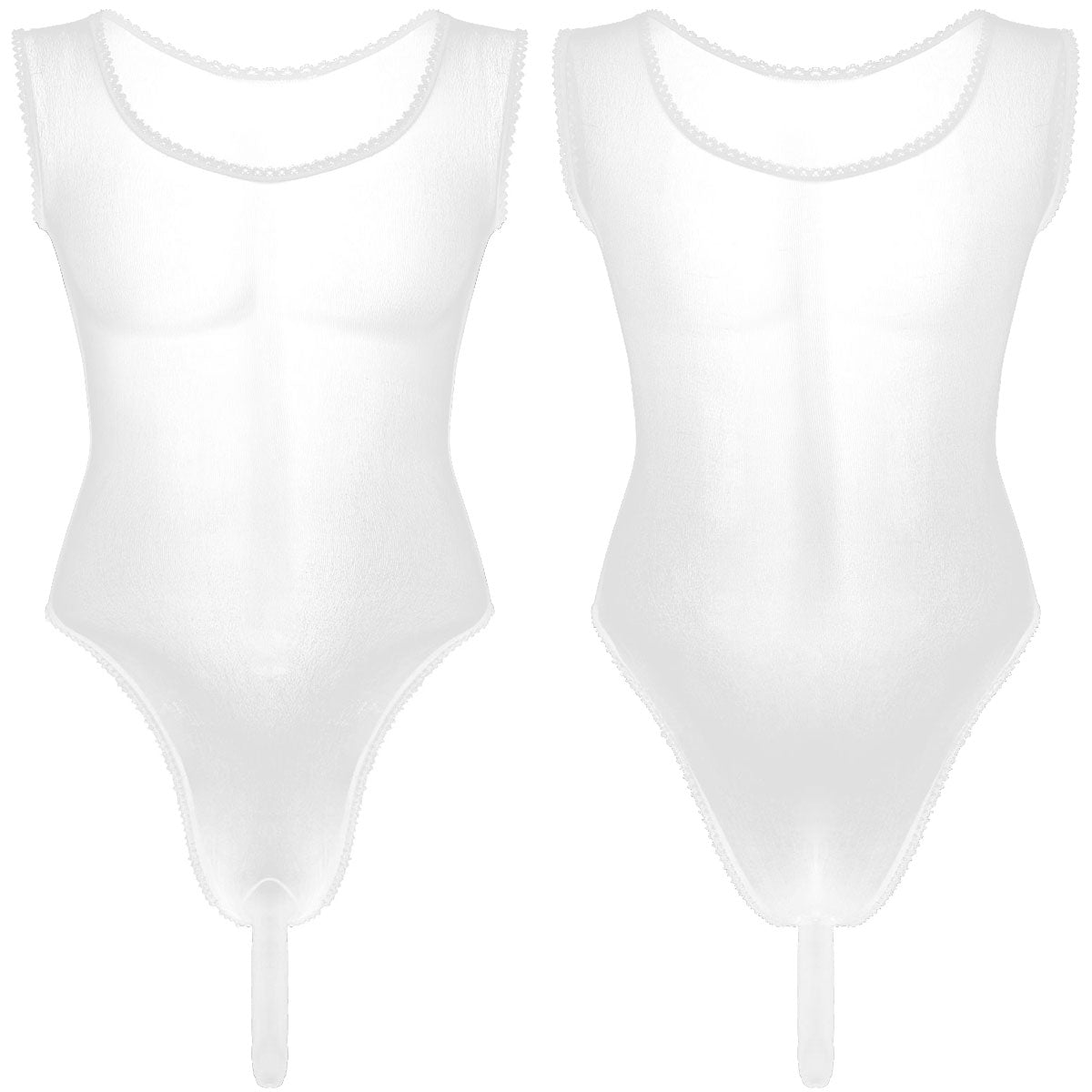 Men’s one-piece sheer mesh leotard jumpsuit underwear, pull on closure.