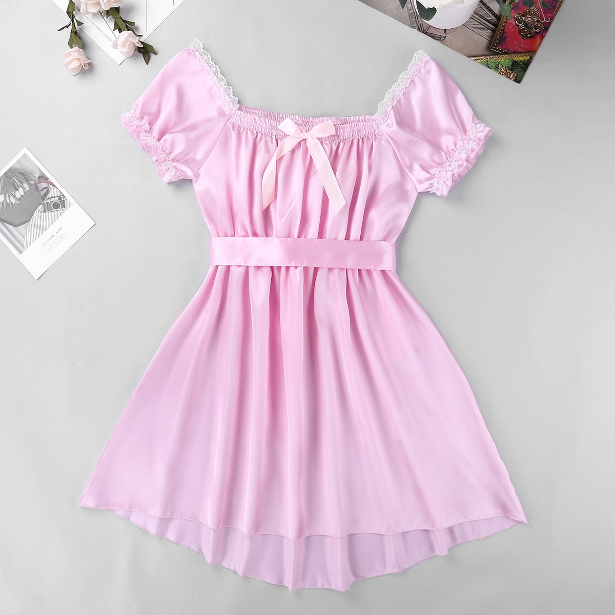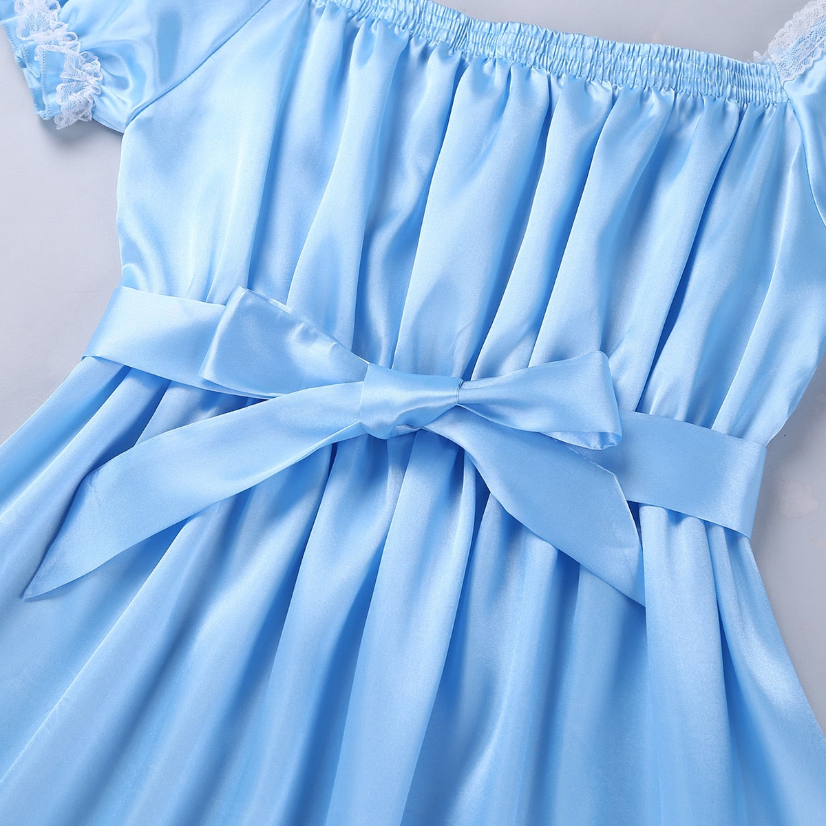 Short sleeves with ruflled lace detail, elastic square neckline, a bowknot in the front.