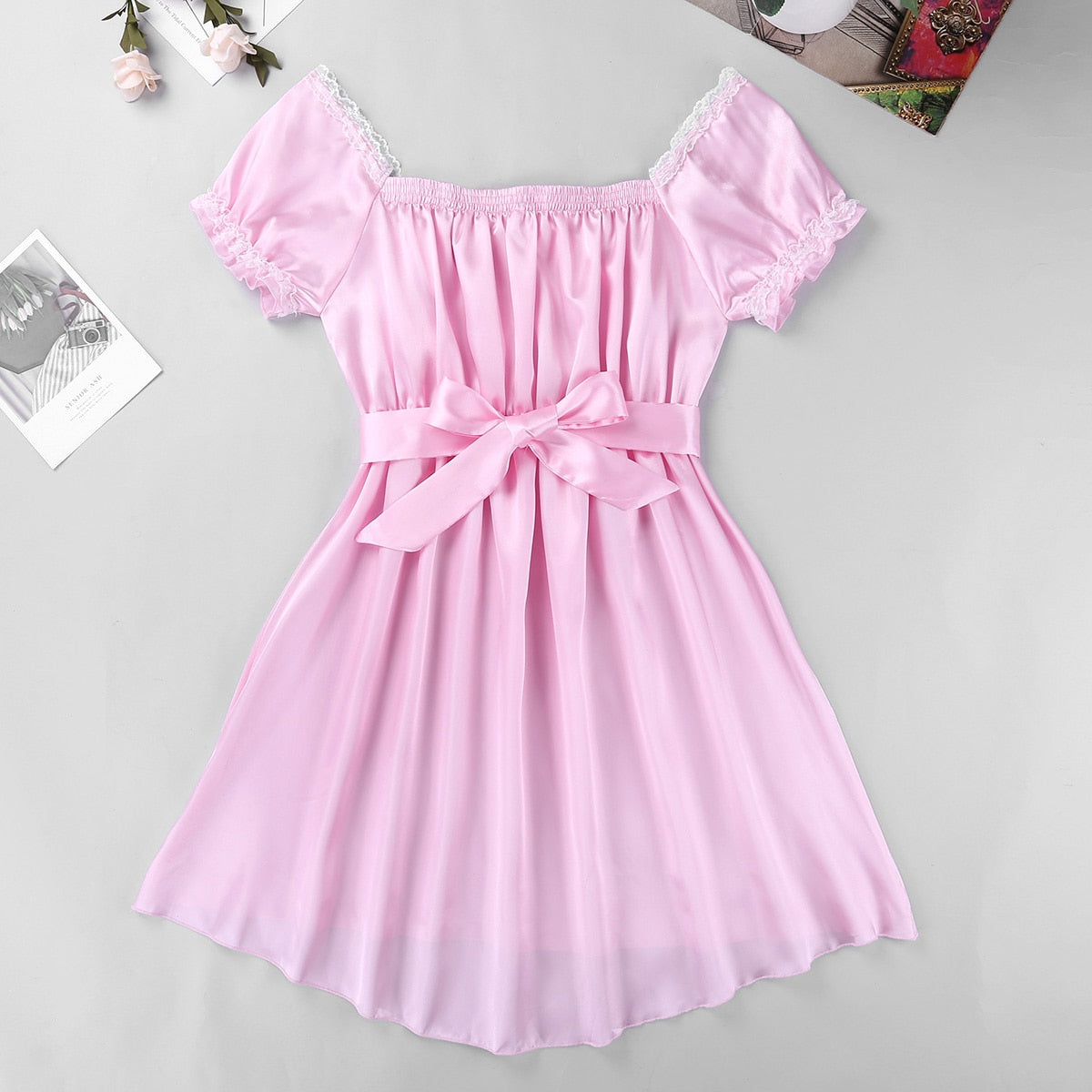 Short sleeves with ruflled lace detail, elastic square neckline, a bowknot in the front.
