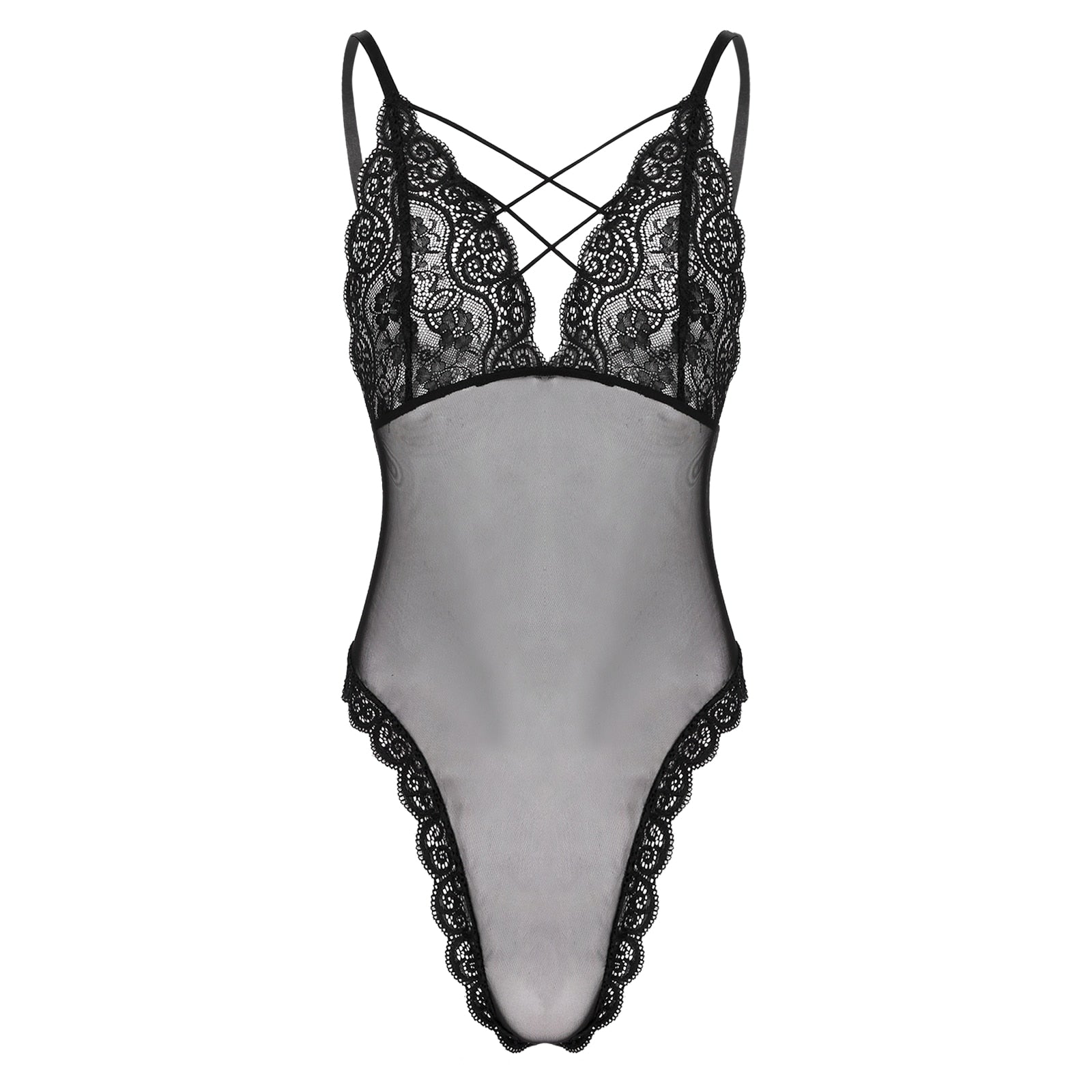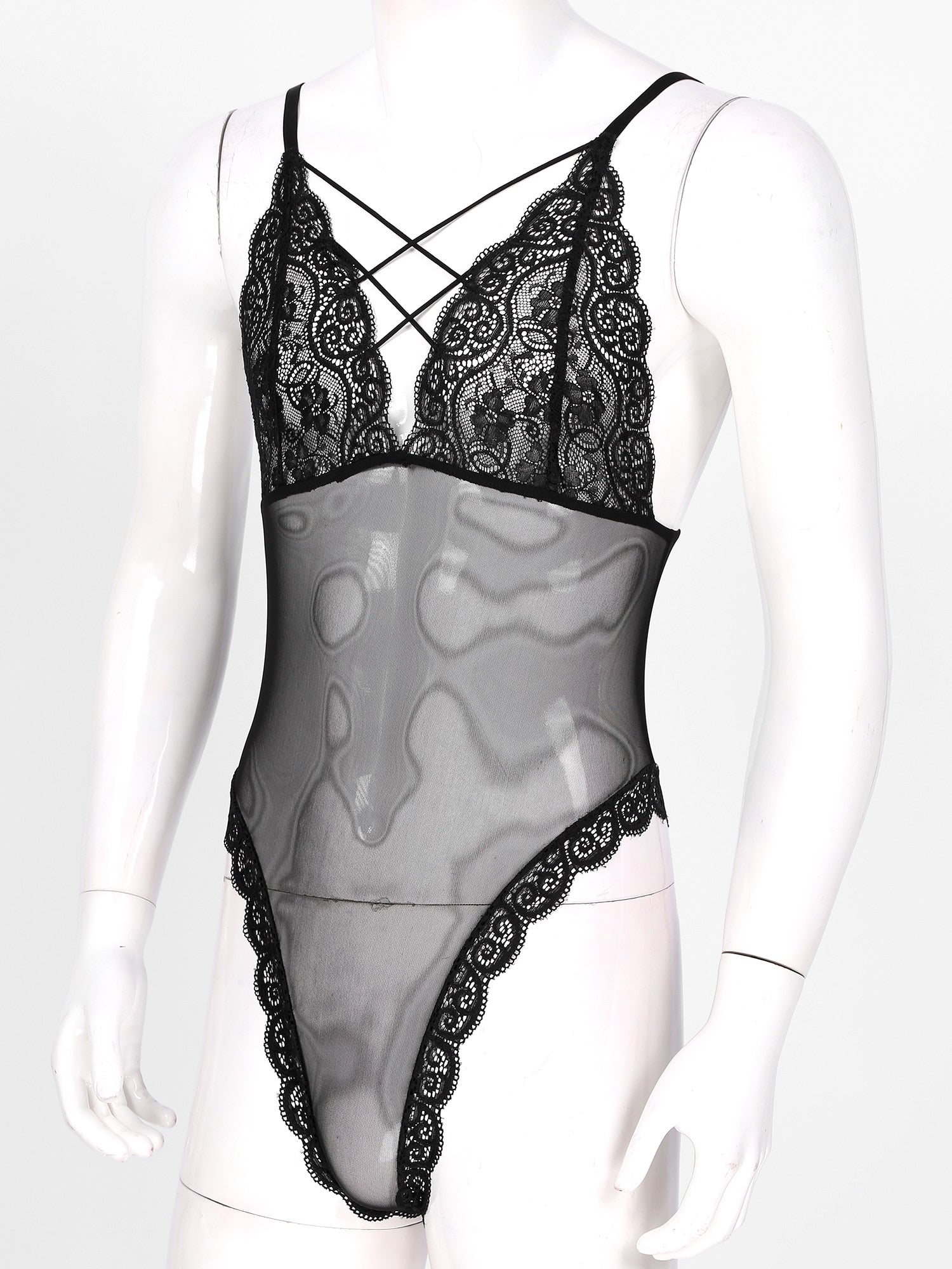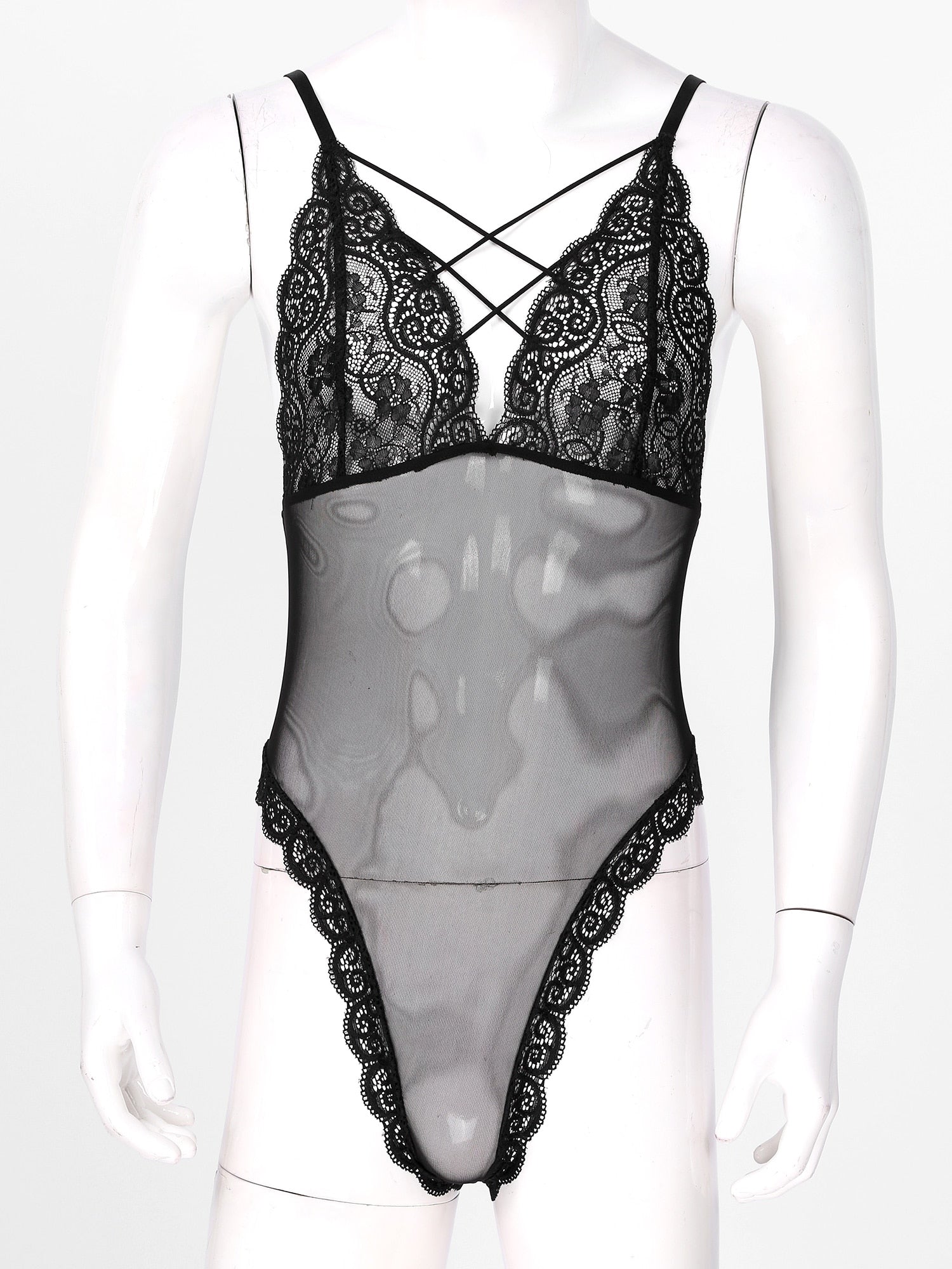 Men Sissy Nightwear Crisscross Strappy Leotard See-through Mesh Lace Patchwork Bodysuit.