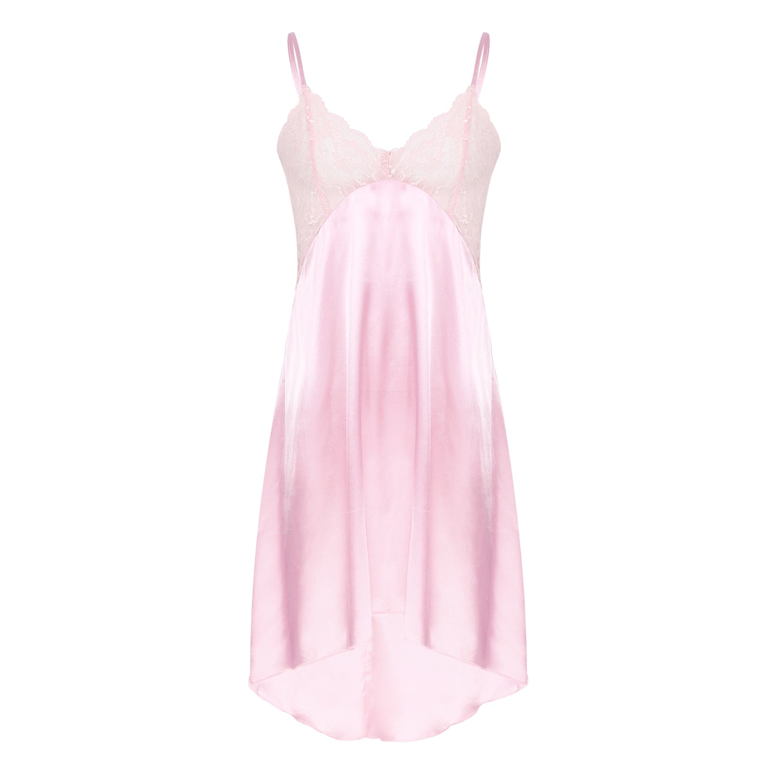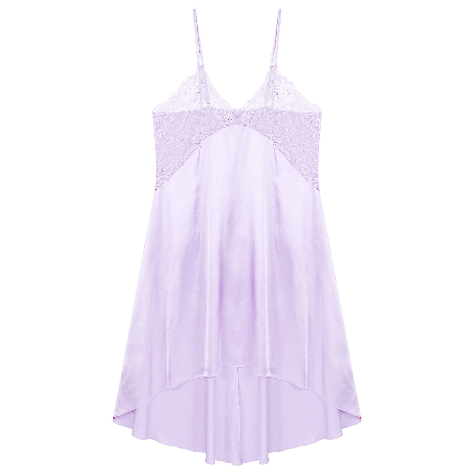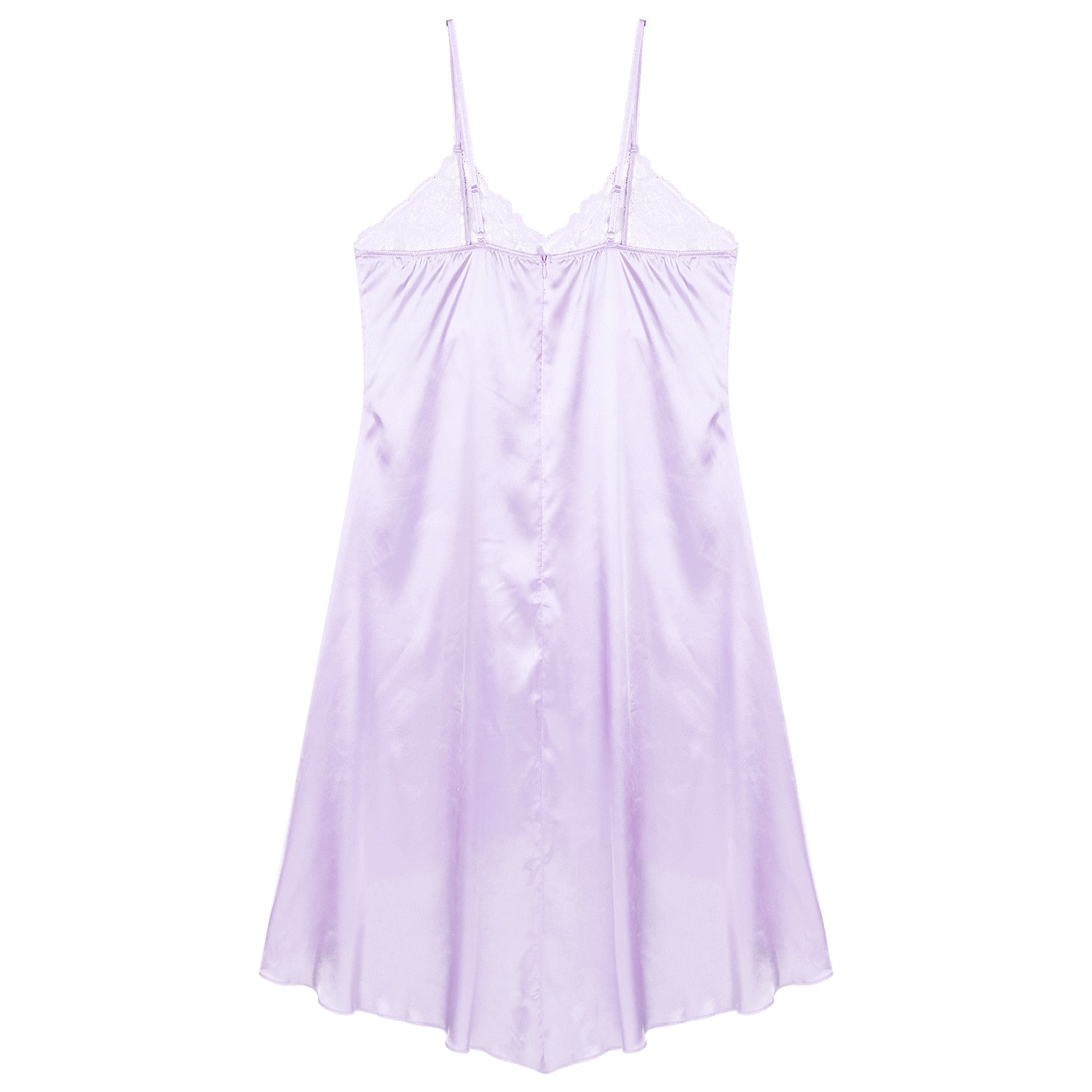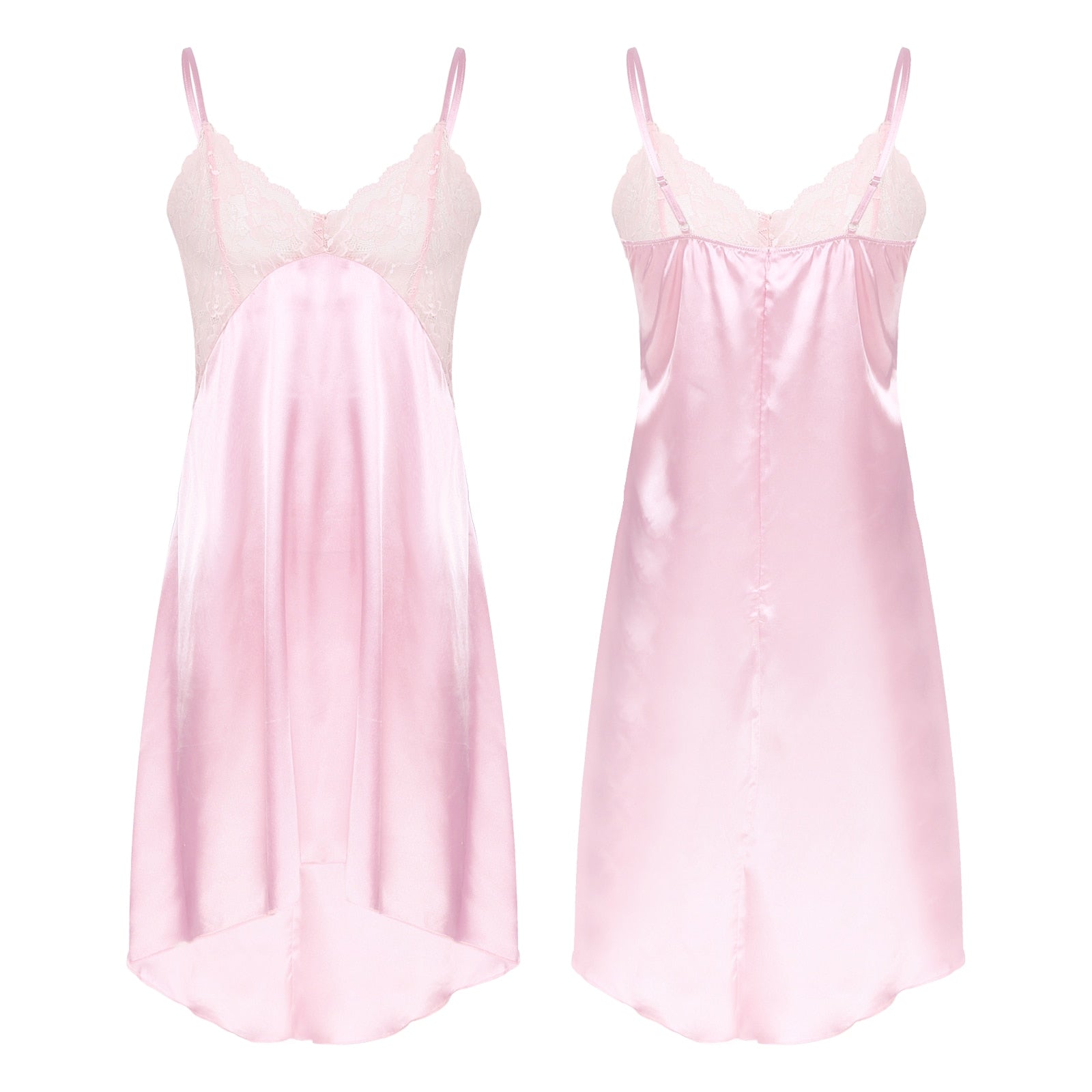 Mens Sheer Lace Patchwork Satin Nightdress Irregular Hem Adjustable Spaghetti Straps Dress.