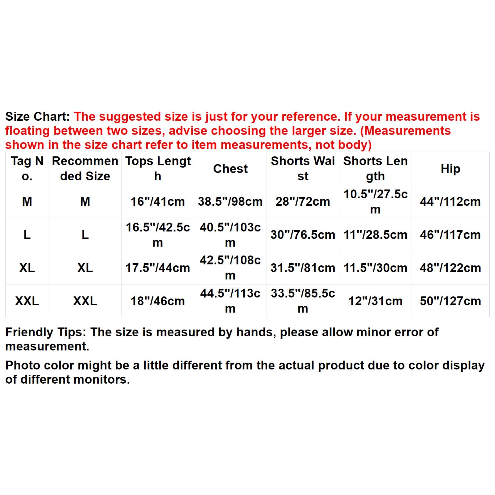 | Tag No. | Recommended Size | Tops Length | Chest | Shorts Waist | Shorts Length | Hip |