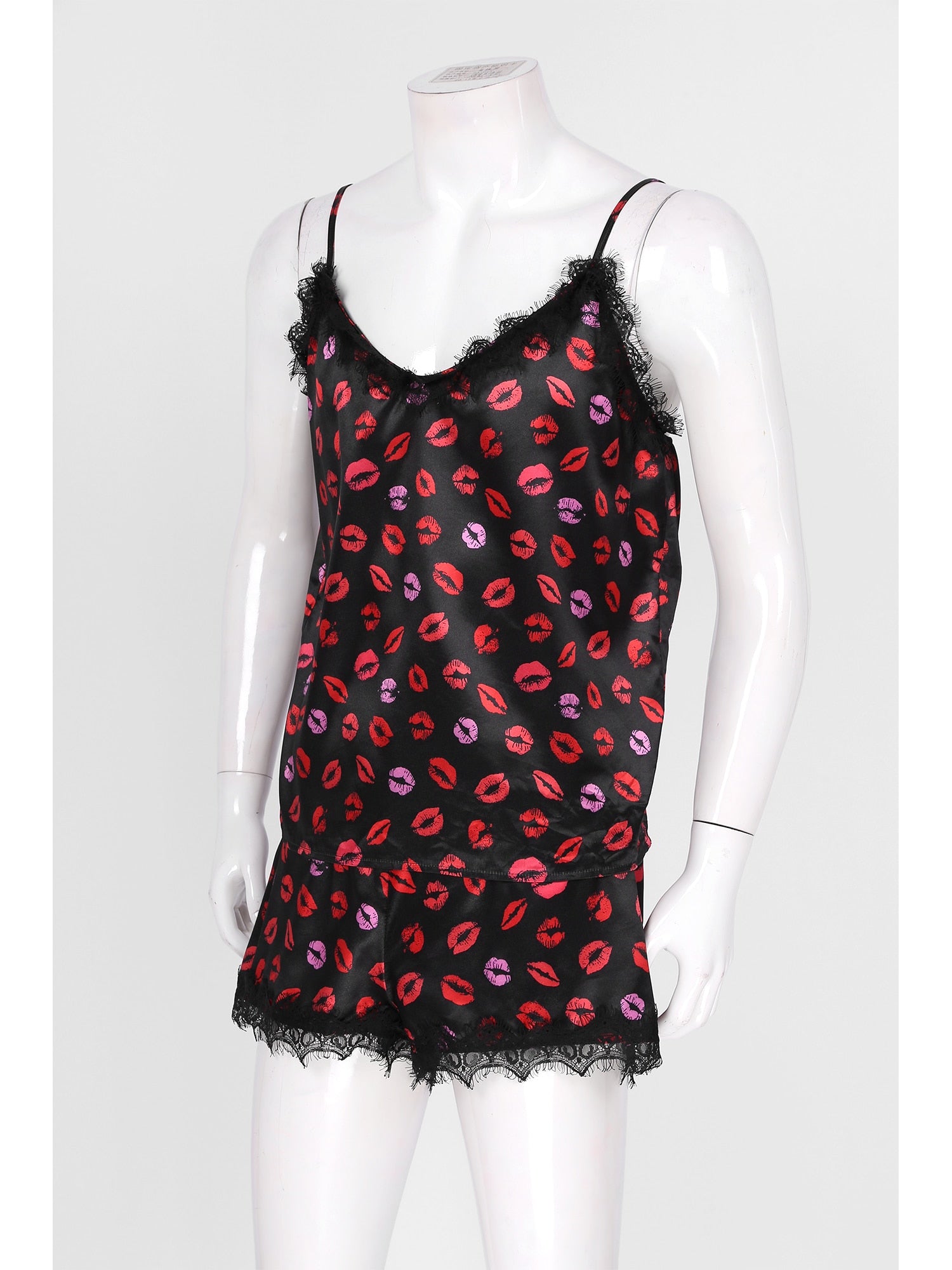 Men Lips Printing Two-piece Pajama Set Lace Trim Sleepwear Sissy Nightwear.