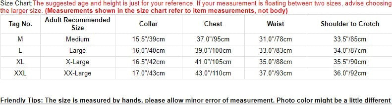 | Tag No. | Adult Recommended Size | Collar | Chest | Waist | Shoulder to Crotch |